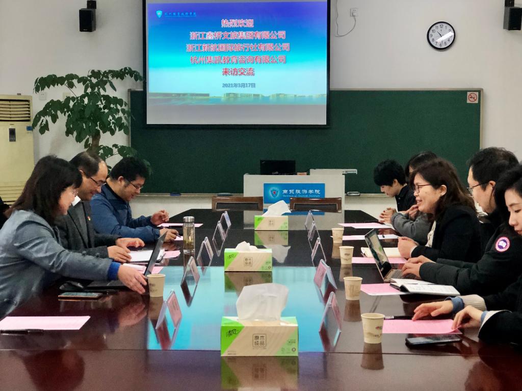 3月17日,浙江鑫桥文旅集团法人代表江英及其下属集团新航国际旅行社、杭州集凯教育咨询有限公司副总经理李永刚等一行来公司实地调研、洽谈合作事宜。商贸旅游公司党总支书记、经理张赵根,副经理袁江军、旅游管理专业负责人杨强及几位专任教师热情接待了来宾。