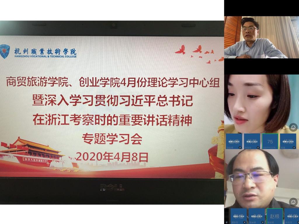 4月8日,商贸党总支通过钉钉远程视频会议系统,召开了4月份政治理论学习中心组专题学习会,本次学习主题是习近平总书记在浙江考察的重要讲话精神。会议由党总支书记姜萌主持,分院班子成员、全体中层干部、党支部书记共同参加了学习。