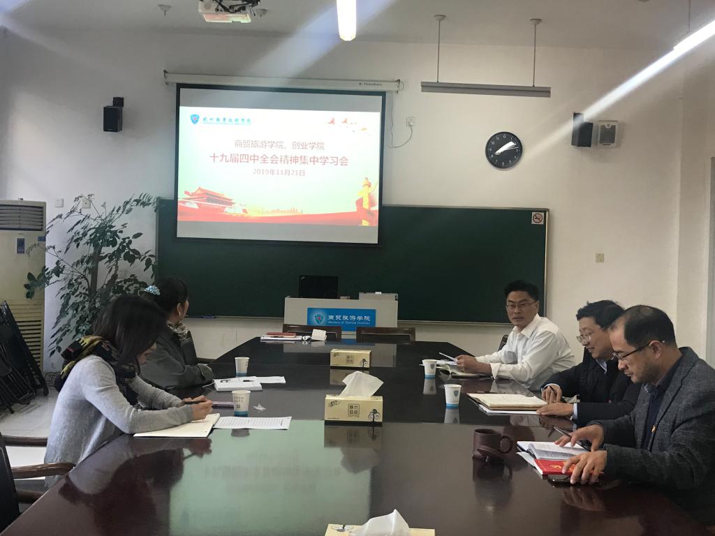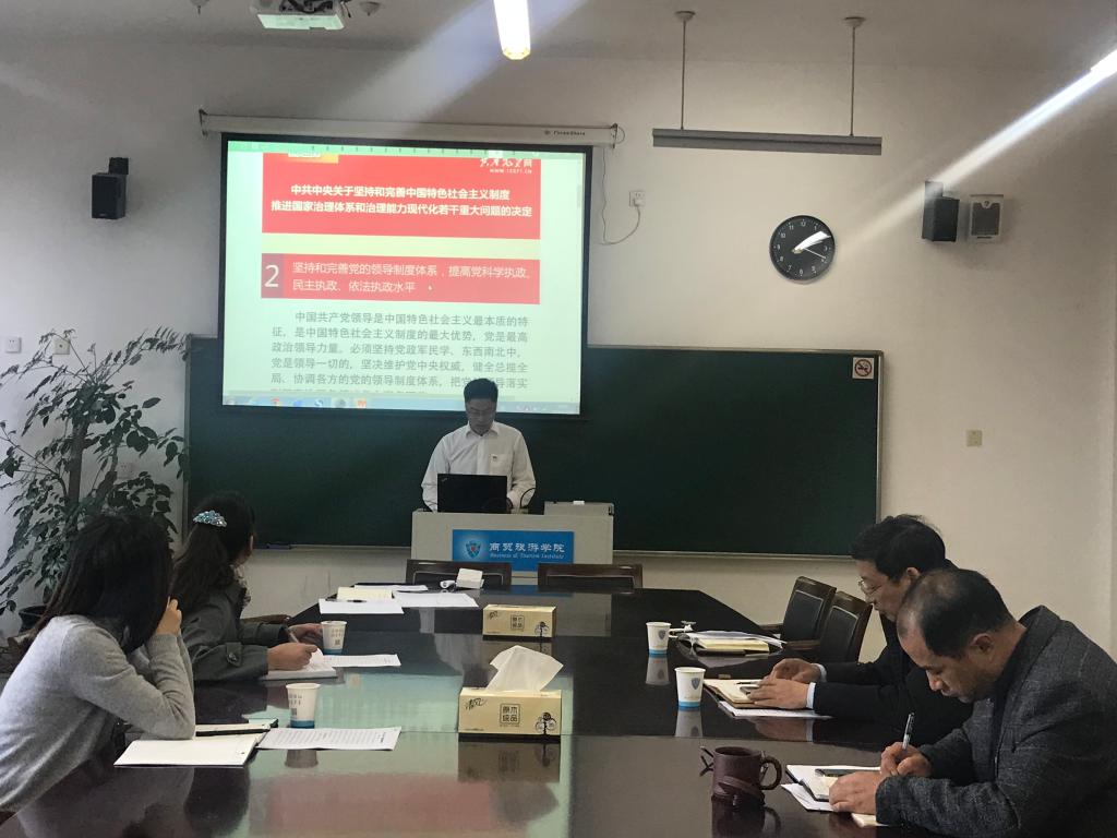 11月21日,商贸党总支召开11月政治理论中心组学习会议,认真学习贯彻中国共产党第十九届中央委员会第四次全体会议精神。党总支书记姜萌主持会议,党委委员、党委组织(统战)部部长麻朝晖参加了学习会。商贸党总支委员全体成员参加会议。