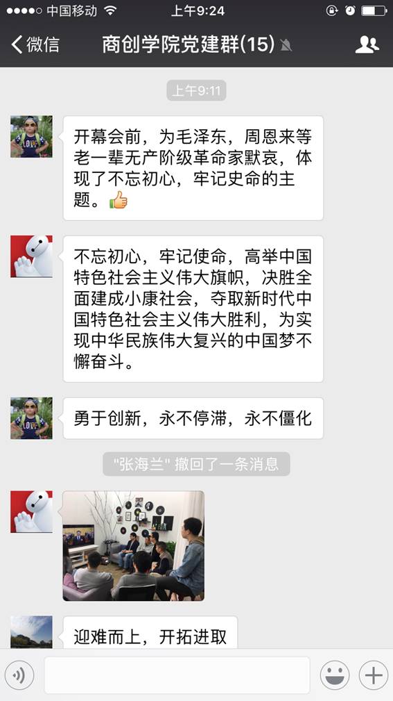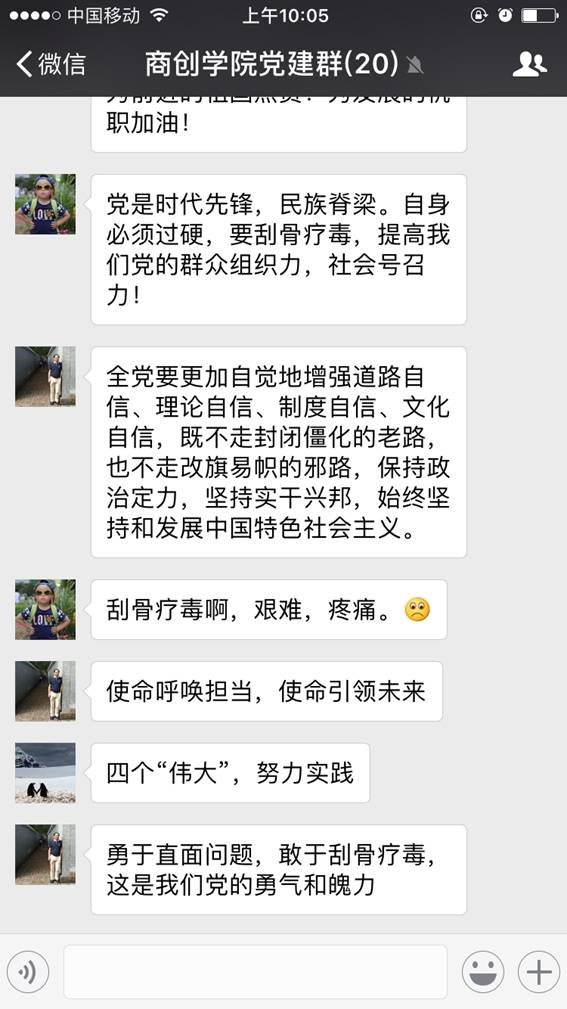 履行神圣职责,不负历史使命,收听收看开幕会的党员教师与员工,在“商创公司党建微信群”上积极讨论,发表即时感悟与体会,认真学习习总支书记的报告精神。同时,分公司党总支二十余位企业党员也准时收看开幕会盛况,第一时间了解了党的执政理念、方针和政策。学习讨论中,商贸党员除了激动自豪之外,更展现了深深的责任意识,还有砥砺奋进、继往开来的精神动力。