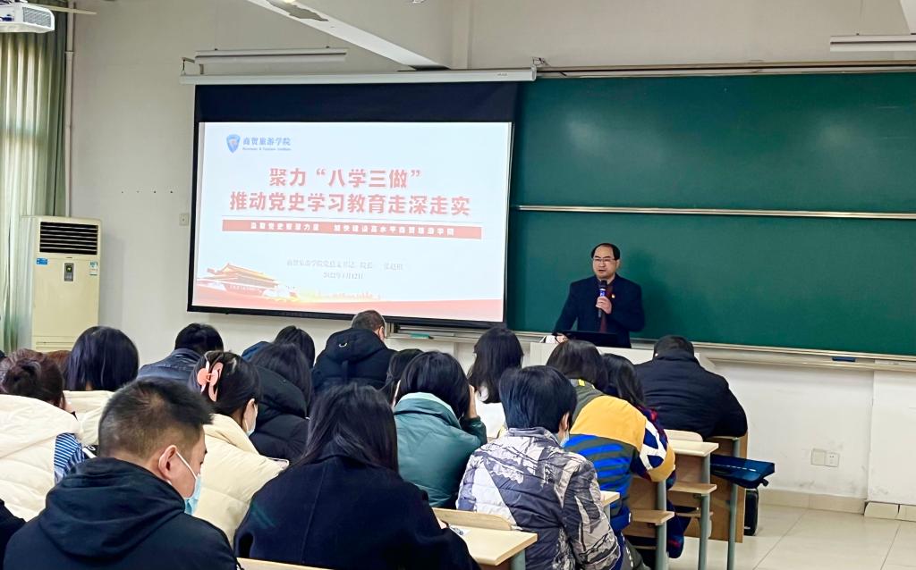 自党史学习教育开展以来,分院精心组织实施、严格对标对表,紧扣“学党史、悟思想、办实事、开新局”主线,结合分院实际,精心组织、周密安排,将党史学习教育和分院改革发展的重点工作深度融合,聚力“八学三做”,扎实推进党史学习教育走深走实,形成全院上下协同、师生人人参与学党史的良好氛围。会上,第四党支部书记孙萍萍、员工党支部书记赵媛媛作交流发言,总结回顾了一年来以党史学习教育抓手,推动电商专业高质量发展和引领商贸学子创新发展的主要成效,成果汇报有数据、有特色、有亮点,突显了“商贸味”。