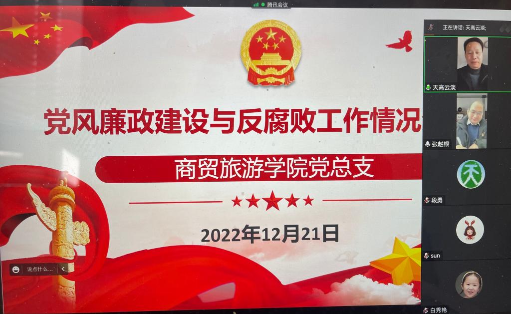 12月21日下午,商贸旅游公司党总支在腾讯会议室线上召开了2022年下半年党风廉政建设和反腐败工作情况分析会。校纪委书记高云飞,特约监督员段勇,分院领导班子成员,全体中层干部、党支部书记、专业负责人参加会议。会议由党总支书记张赵根主持。