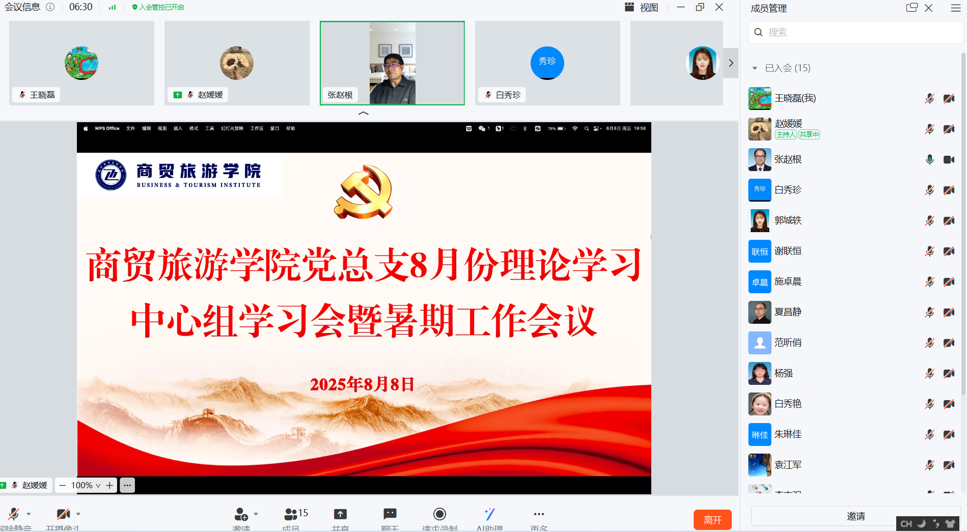 8月8日,商贸旅游公司党总支通过钉钉平台线上召开8月份党总支理论学习中心组学习会暨暑期工作会议。分公司党总支委成员、党支部书记、中层干部参与学习研讨,会议由党总支书记、经理张赵根主持。