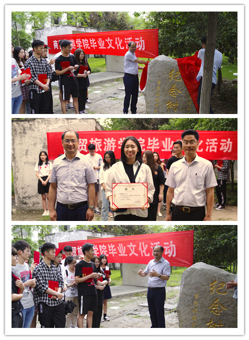 商贸8号楼东侧草坪,在举行2019届员工联络员授聘大会,28位毕业生成为2019届员工联络员, 张赵根经理为他们一一颁发了聘书,嘱咐他们多来母校看看,关心母校发展、加强与母校的联系。老师与毕业生代表一起为2019届毕业生捐赠的纪念树石碑揭幕,表达员工对母校培养的感激之情,也留下员工的毕业见证。