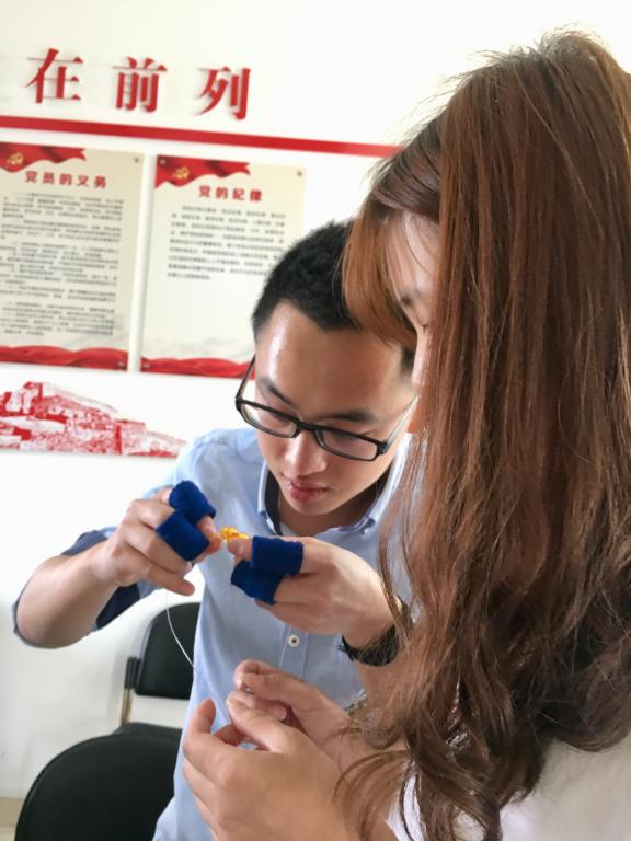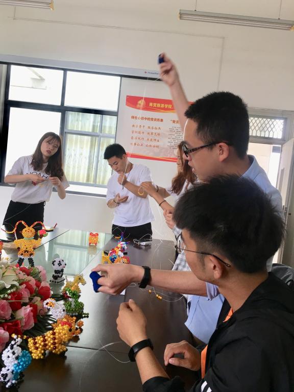 戴海洋首先向大家展示了自己制作的十二生肖和孙悟空的串珠工艺品。栩栩如生的精致作品,引来了现场一片赞美声。然后戴海洋向大家学教授生肖猪的制作。他做一步,讲解一步,再逐一指导,直到大家都完成了再进行下一步制作讲解。面对如此细致的手工活,三位男生现场打起了退堂鼓,戴海洋对他们耐心指导,谆谆鼓励。他们从一开始的手足无措,再到后面的熟练掌握,经过三小时的学习制作,作品陆续完工。大家看到成品的那一刻,都异常高兴和激动。