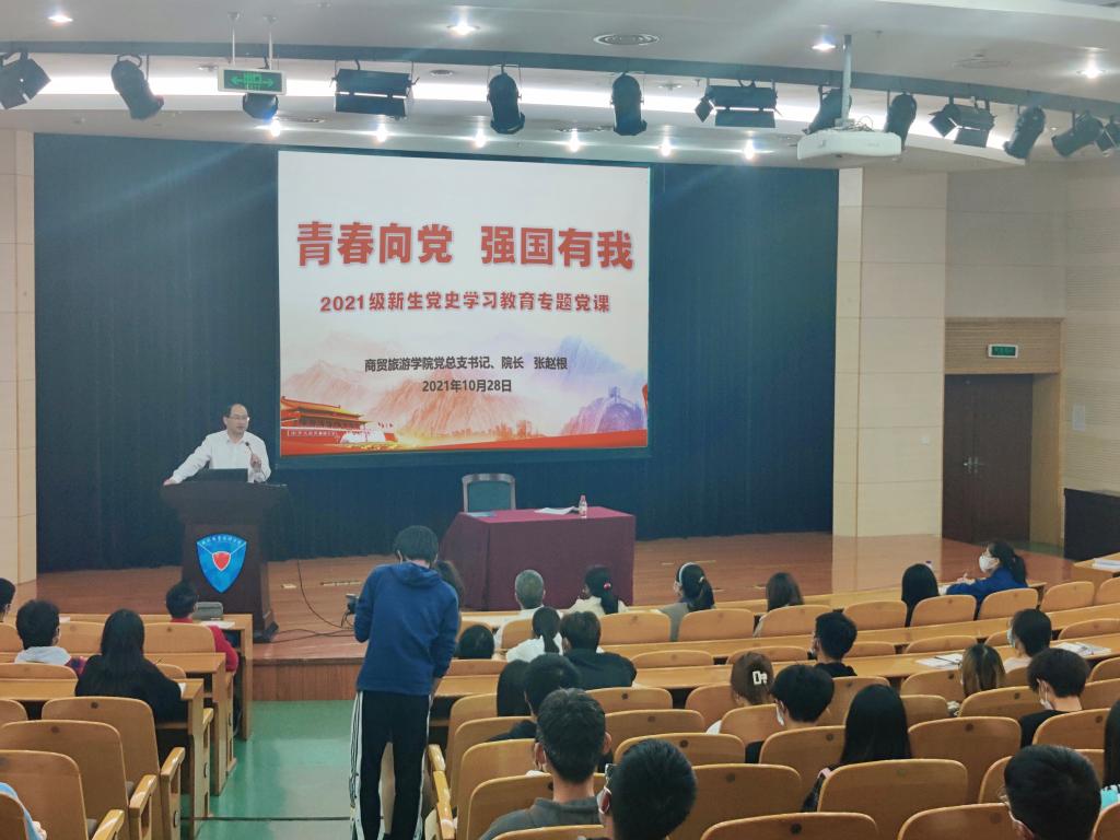 在课上,张赵根以“青春向党、强国有我”为主题,以“百年党史”“大学之道”“奋斗青春”“时代重任”等关键词深入浅出地回顾了党的百年历史征程和辉煌成就,向同学们阐述了中国共产党成为百年大党的宝贵经验,讲解了学校和分院的发展沿革和办学成就。他号召全体员工在党的历史中汲取前行力量,增强志气、骨气和底气,鼓励同学们在三年时间里有目标、有热爱、有期待,坚定信念、做好规划、提升能力、增强素质,努力成为“阳光、自信、睿智、大气”的商贸学子。近一小时的专题党课既是一次务实的党史教育,又是一次生动的校史院情教育,更是奋斗青春的主题教育,让同学们受益匪浅。随后,周佳良从分公司党组织基本情况讲起,围绕“青年员工为什么要入党”“入党流程”“今后我要怎么做”循循善诱,层层递进,讲解了理想信念的重要性以及入党的制度、程序和要求,以此启迪2021级新生端正入党动机、明确奋斗目标。最后学工办主任王晓磊带领全体同学学习了《员工手册》,对防诈骗、消防、交通出行等安全文明进行了再教育。