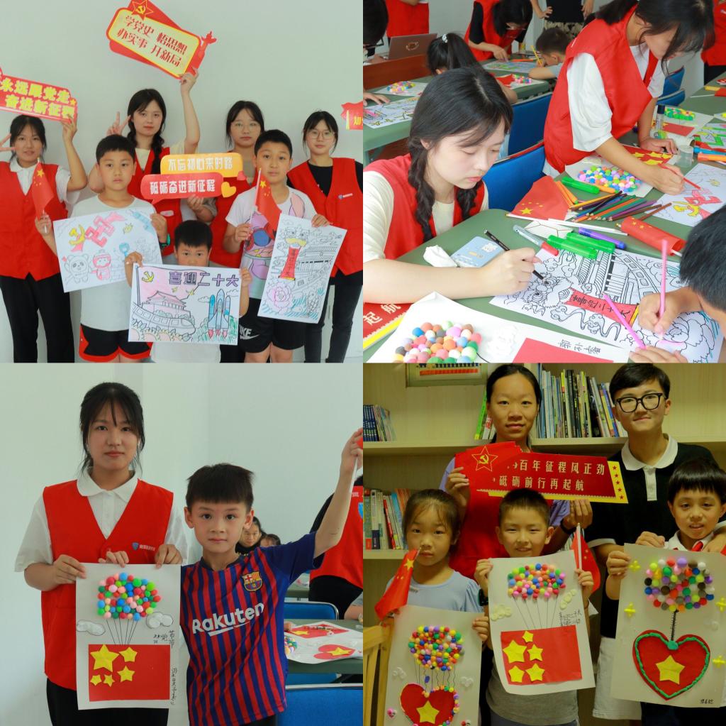 活动一开始,团队成员带领小朋友们通过演唱《听我说谢谢你》和手势舞表达对党和祖国的感谢热爱。随后团队成员通过袁隆平院士和钟南山院士的歌颂词,让在座的小朋友们了解学习了两位英雄令人瞩目的成就和高尚的品格。接下去,在党史知识竞答环节,小朋友们勇于学习党史,积极抢答问题;在“行动心向党”手工环节,小朋友们在团队成员的指导下,制作出了“五星红旗”等漂亮的彩泥作品。最后,小朋友们用画笔涂色的方式来喜迎二十大的召开,并在小卡片上写下了对祖国母亲的祝福,纷纷表示要努力成长为新一代社会主义事业的建设者和接班人。