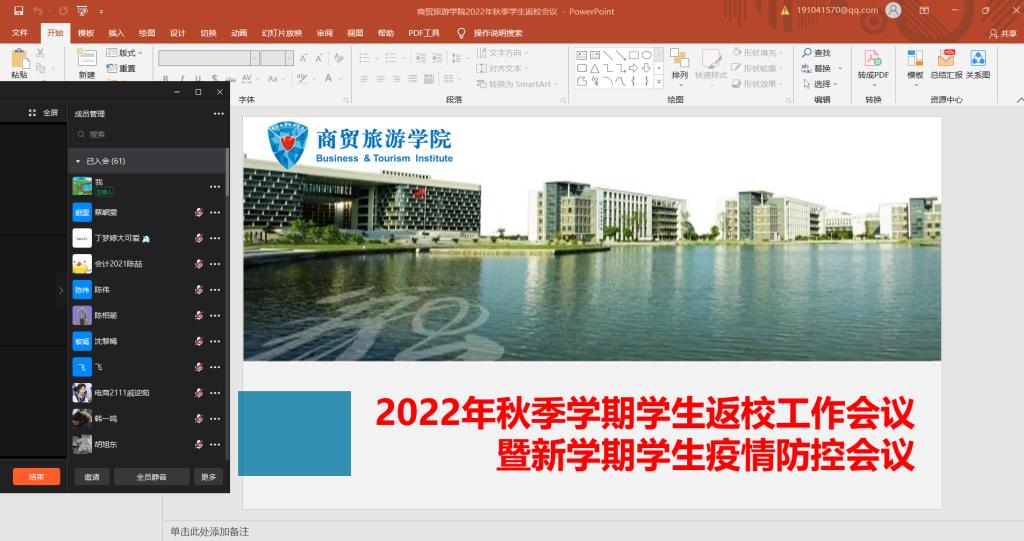 随着九月的临近,新的学期即将开启。为做好疫情防控,保障师生安全,严格落实学校期初开学疫情防控政策。8月30日晚,yl1111永利集团举行钉钉在线会议,对2022年秋季员工返校工作进行部署,对期初员工疫情防控进行培训。yl1111永利集团学工办王晓磊、陈玉燕,20、21级全体班主任、班长参加会议。