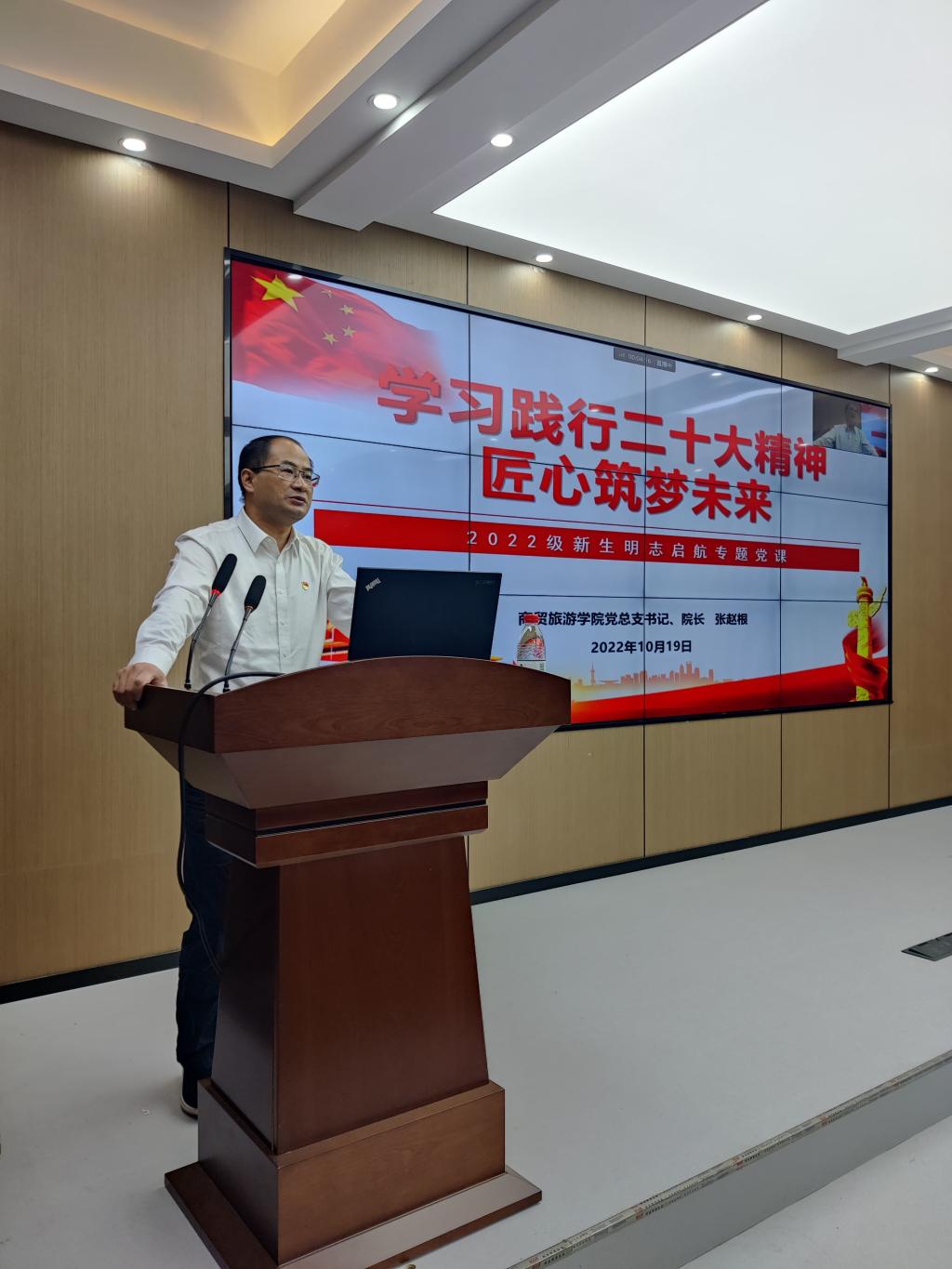 为学习践行党的二十大精神,让大一新生加强对党的认识,厚植爱党爱国情怀,快速融入学院。10月19日晚,yl1111永利集团2022级新生明志启航课开讲,分公司党总支书记、经理张赵根为同学们讲授“学习践行二十大精神、匠心筑梦未来”专题党课,分公司党总支副书记周佳良作入党启蒙教育。2022级全体新生按照疫情防控要求,分别在数字商贸培训中心和各班级教室听讲。学工办王晓磊主持,组织员白秀珍、辅导员郭明瑜参加。