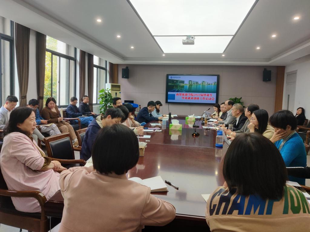 最后,张赵根对全面启动分院毕业就业创业工作进行了部署和强调。他指出“就业工作是专业建设和人才培养成效的试金石”,并对分院2023届就业工作提出了四点要求:一要提高站位,强化担当,增强做好就业工作的使命感和责任感;二要明确目标,落实责任和任务,精准对接,对师生群体加强就业培训,有针对性地开展工作;三要全力做好访企拓岗促就业行动,持续为毕业生挖掘更多实习就业岗位资源,助力毕业生更加充分就业、高质量就业;四要精准施策,全员全面全力推进毕业生就业工作。他希望商贸全体老师心存危机意识,以高度负责的态度实施分院“323”就业服务体系,打造有效度、有广度、有温度的就业工作。