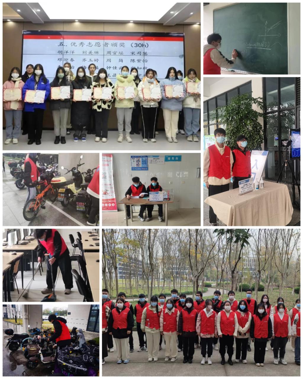 本次活动在12月5日的“志愿者表彰大会”中拉开序幕,大会总结了过去一年分院志愿活动取得的成绩,并为在志愿活动中表现优异的同学们颁发了优秀志愿者证书,以此激励广大同学向先进看齐。“志愿者礼仪培训会议”对志愿者进行了微笑、站姿、走姿、仪容仪表、服务礼仪等文明礼仪培训,内容细致丰富,为今后提升志愿服务质量提供了更多文明力量。“共建文明校园”活动中,每位志愿者在校园各个区域的停车高峰期规范整理违规乱放的单车,积极引导停车的同学遵守停车秩序、规范停车、保持车场整洁。除此之外,志愿者们对商贸教学楼周边的台阶、草地等处落叶、烟头、白色污染垃圾进行清扫,并走进教室认真细致地清理地面、讲台、书桌、窗台等区域,为美丽的校园增添了一道道绚丽的色彩。“共创美丽餐厅”活动中,志愿者们接替食堂工作人员主动为同学们打汤,并在窗口处贴上“节约粮食,文明就餐”的标语。志愿者们手拿“饭后垃圾需分类,餐具摆放要文明”的标牌,并提醒就餐员工无机垃圾、食物残渣和餐具要放在相应位置。