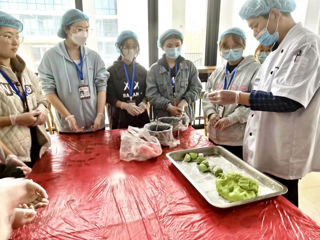活动伊始,圆心舍全体成员在教室观看《家国清明·纪念》专题纪念片,缅怀先烈。纪念片中的一代代革命英烈为了中华民族的复兴,为了中国人民的福祉,前赴后继勇于斗争,用血肉之躯建立了新中国。在座的同学深切感受烈士们崇高的爱国精神,表达对先烈的感恩与敬仰。观影结束后,同学们来到锦晖苑食堂二楼制作青团。青团是清明节传统食品,在食堂阿姨的指导下,同学们发挥奇思妙想,相互配合、协作互助,一起揉面、按压、包馅。有的捏成中规中矩的球形,有的捏成饺子形、爱心形、星形等各种形状,大家干劲十足,现场其乐融融。制作过程中,同学们忆往思今,抒发感慨,畅想未来,将对先辈的哀思和对春天的美好期望融入这小小青团中。不知不觉间,青团已做了好几盘,上架蒸熟后,色如碧玉,糯韧绵软,清香扑鼻,同学们品尝着亲手做的青团,倍加珍惜当前来之不易的生活。
