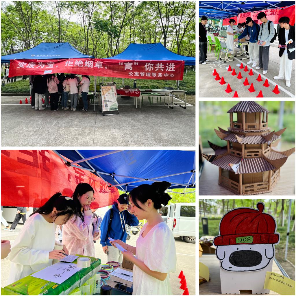 在现场,“拒绝烟草”赛道的商贸师生通过套圈抽题的方式,开展禁烟知识问答抽奖进行回答。活动现场热闹纷呈,经过的同学都积极参与,通过答题学习禁烟知识。现场工作人员还邀请分院师生在禁烟横幅上签名,以共同行动创建无烟校园,自觉承诺做到不吸烟,并互相提醒和监督身边人。此外,在活动场地的另一侧摆放的是同学们数十件“变废为宝”作品。《捡垃圾的小红狗》《相机里的秘密》《花房》等作品都是由废弃快递盒改造的精美小艺术品,手工制作不但展现了同学们的环保意识、创新意识,而制作过程更是一次很好的劳动实践教育。