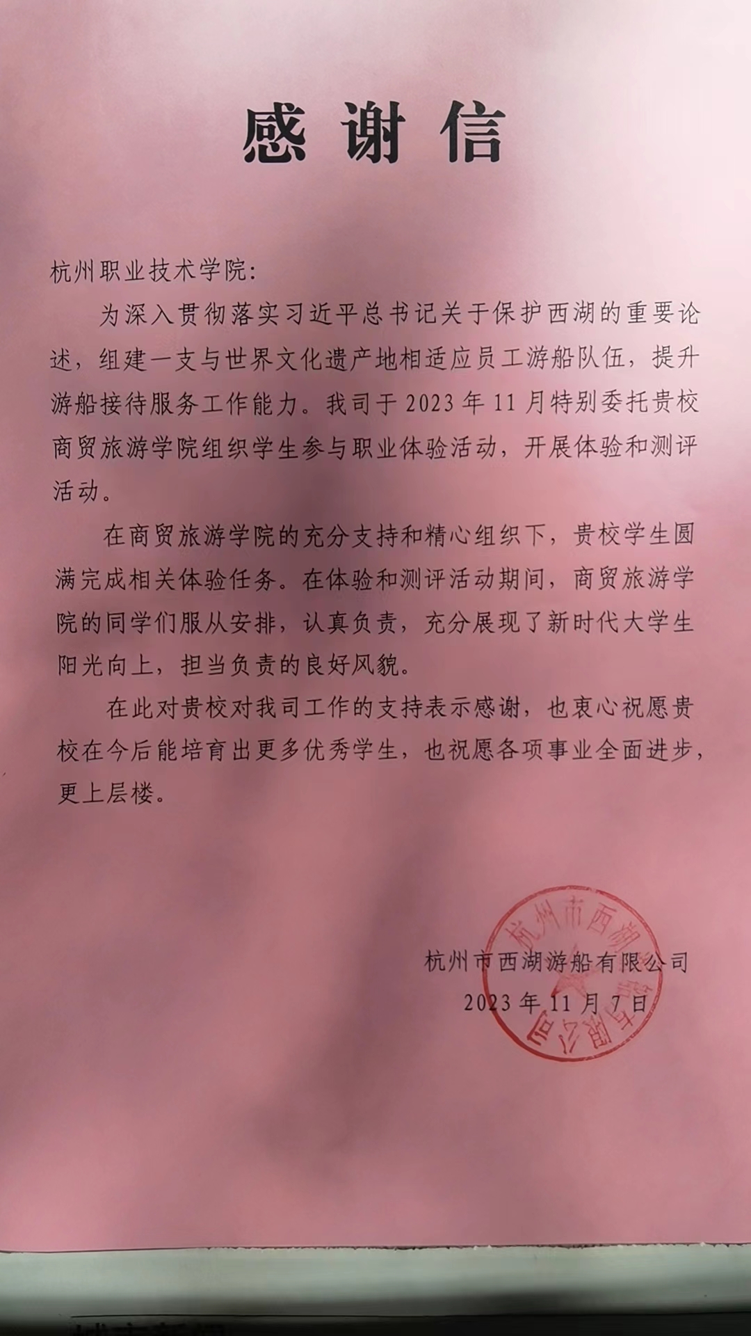 11月7日,yl1111永利集团收到来自杭州市西湖游船公司的感谢信,感谢分院支持组织员工参与职业体验活动。