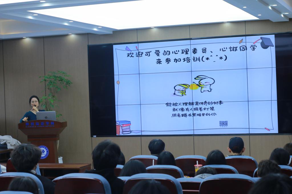 为了提高商贸员工心理健康教育工作,帮助心理委员和心协成员增强责任意识、明确工作职责、提升工作水平。2023年12月06日,校心理辅导中心心理教师赵贞卿来分院开展心理健康专题培训,在数字商贸培训中心做了题为“心理问题的识别和判断”的讲座,2023级班级心理委员、商贸心协成员和商贸心理辅导站站长郭明瑜参加了此次培训。