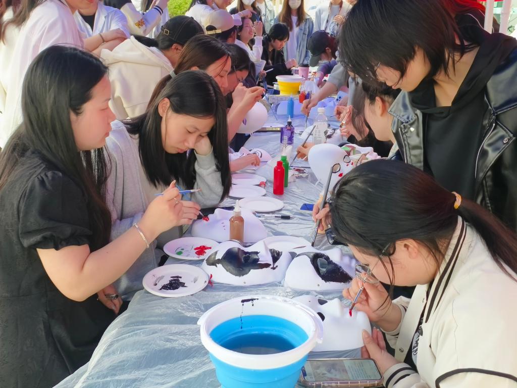 活动现场氛围热烈,同学们手拿画笔,一笔一笔精心描绘着手里的白色面具,将内心的情感与想象融入面具之中,色彩在同学们笔下翩翩起舞。有的面具色彩斑斓,充满活力,有的面具线条简约,朴素深远。每一个面具都承载着同学们的创意和心血,也展现出了大家独特的个性与风采,并互相交流着创作心得和心情故事,共同分享着快乐。