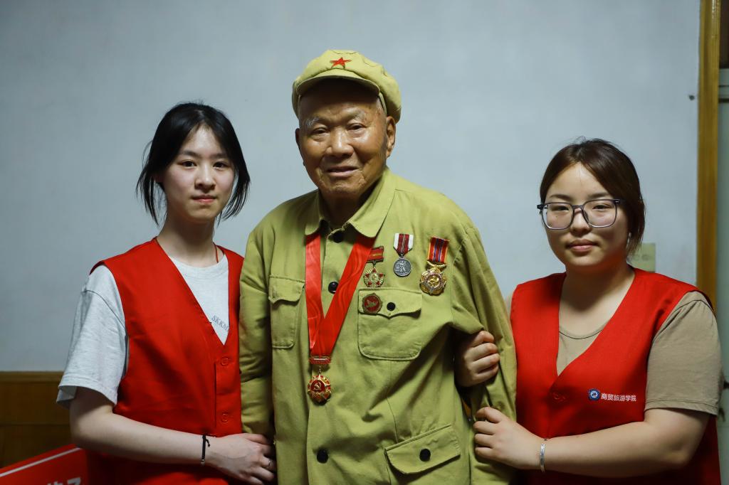 正值三伏天,实践团师生冒着酷暑,走访慰问抗美援朝老兵,用声光影的镜头记录老兵战斗的戎马生涯。汾口镇杨旗社区的郑道福,在抗美援朝战争中荣立三等功,今年93岁高龄,身体还算康健,谈起过去的烽火岁月,老人一下就打开了话匣子。“1952年10月,我们跨过鸭绿江进入朝鲜,不管是小雨还是大雪,夜晚都要奔走100多华里。因为房子都被美国人炸光了,我们就睡在草地里。就这样连续行军两个月,一直到三八线。我们那个时候在三八线618阵地打阻击战,连续打了七天七夜,每天晚上要打退美国士兵的好几次进攻。”与美军周旋作战的一幕幕,郑道福至今仍能清楚讲述。