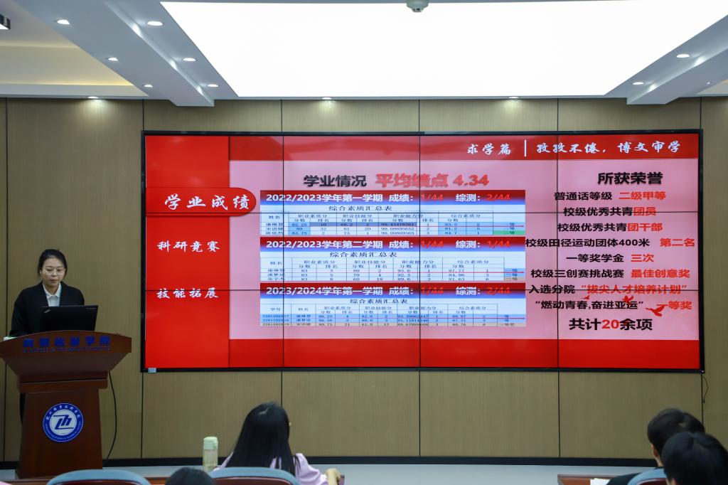 经过前期的个人申报、学院初审,共有7名同学入围现场答辩。评选会上,各位候选人在有限的时间内从自己在校期间的学业成绩、任职荣誉、技能创新、社会服务等方面进行全面陈述,展现了公司学子良好的精神面貌。评委老师认真聆听了每一位候选人的答辩,并进行认真点评,根据其PPT展示内容提出有针对性的修改建议,帮助同学们找准改进方向。