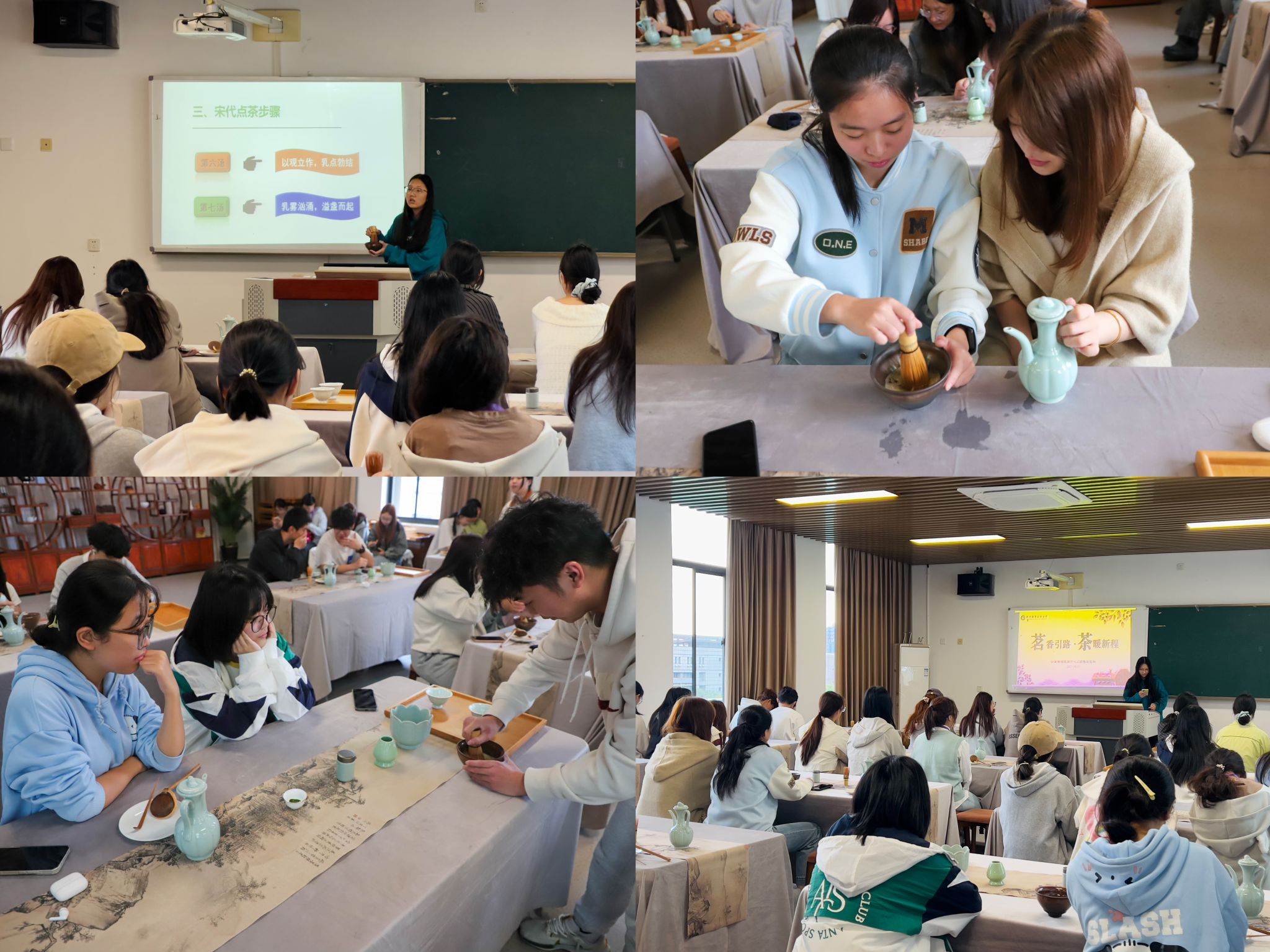 活动现场茶香氤氲,古色古香的茶具沿桌整齐陈列,悠扬淡雅的古琴曲缓缓流淌,为整场活动奠定了雅致的文化基调。本次活动特别邀请茶艺社成员担任指导,带领新生沉浸式体验传统茶艺。在指导过程中,师生们亲手拿起茶筅,认真学习击拂茶汤的技巧。不少熟练掌握手法的参与者,还成功用茶粉在乳白的茶汤表面,勾勒出花草、文字等简易图案,将茶艺与创意巧妙结合。