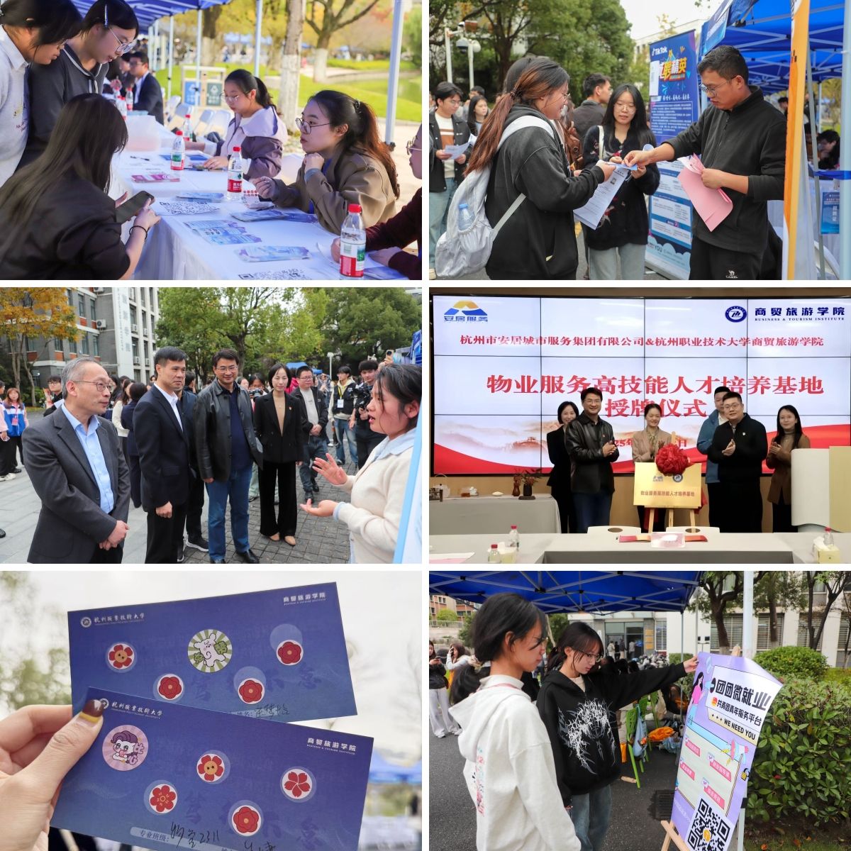 本次招聘会学院充分发挥学科专业优势与校企合作资源,成功邀请并组织70家与学院专业设置高度匹配的知名企业参会,提供900余个岗位。活动现场同步举行杭州市安居城市服务集团有限公司“物业服务高技能人才培养基地”授牌仪式、和达物业服务就业导师聘用仪式,为毕业生搭建精准就业桥梁。