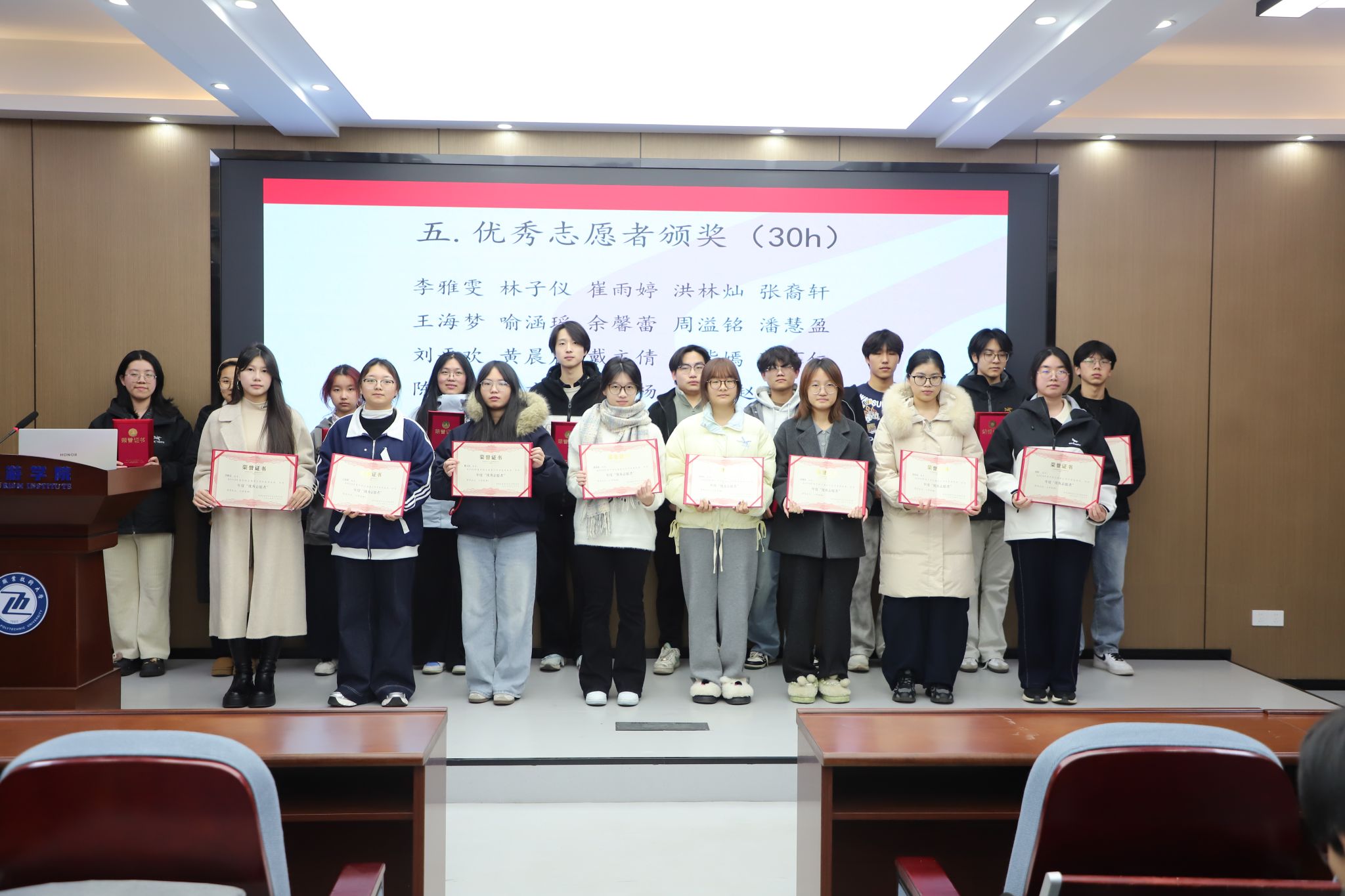 在颁奖环节,22名志愿时长超30小时的同学、9名超60小时的同学依次登台——这份荣誉,是对“风雨无阻坚守”的肯定,更是对志愿精神的传承。青协部长郑嘉欣在展望中承诺,协会将以更优质的平台、更完善的成长体系,让每一份善意精准落地。新干事李雅雯以“保持热爱、主动成长”的宣言,道出新生志愿者的朝气与决心。