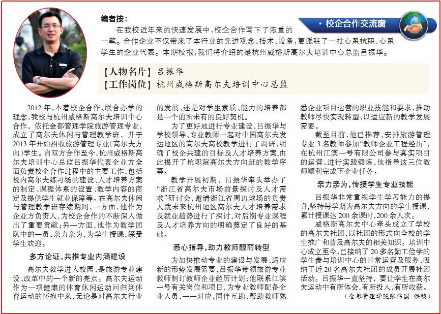 编者按:在公司近年来的快速发展中,校企合作写下了浓重的一笔。合作企业不仅带来了本行业的先进观念、技术、设备,更派驻了一批心系杭职、心系员工的企业代表。本期校报,我们将介绍的是杭州威格斯高尔夫培训中心总监吕振华。