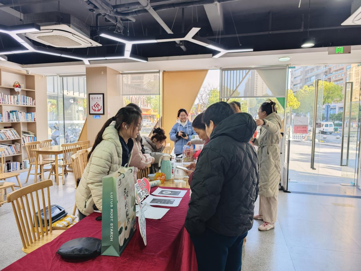 活动现场气氛热烈,“藕遇新年”的喜庆氛围吸引了众多社区居民驻足。同学们细心地向居民介绍三家村藕粉的历史渊源、制作工艺以及冲泡技巧。通过现场演示与互动品鉴,让居民近距离感受传统技艺的独特魅力,有效促进了品牌文化与非遗知识的传播。