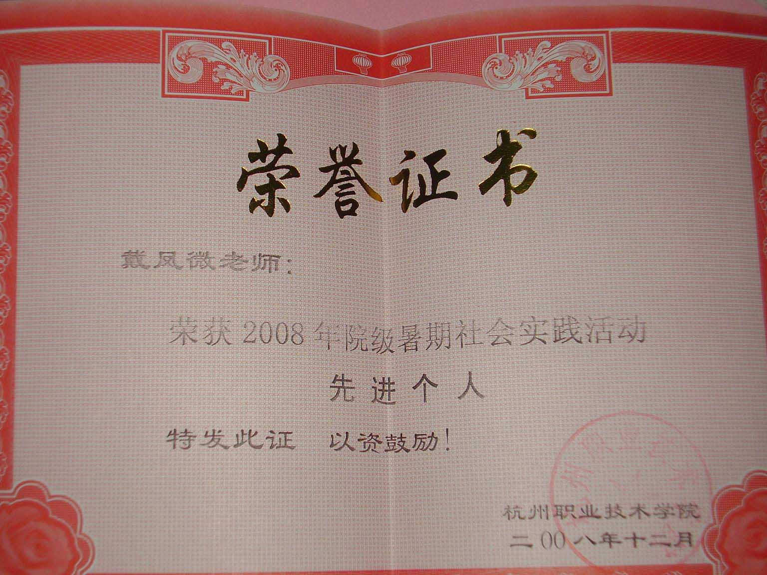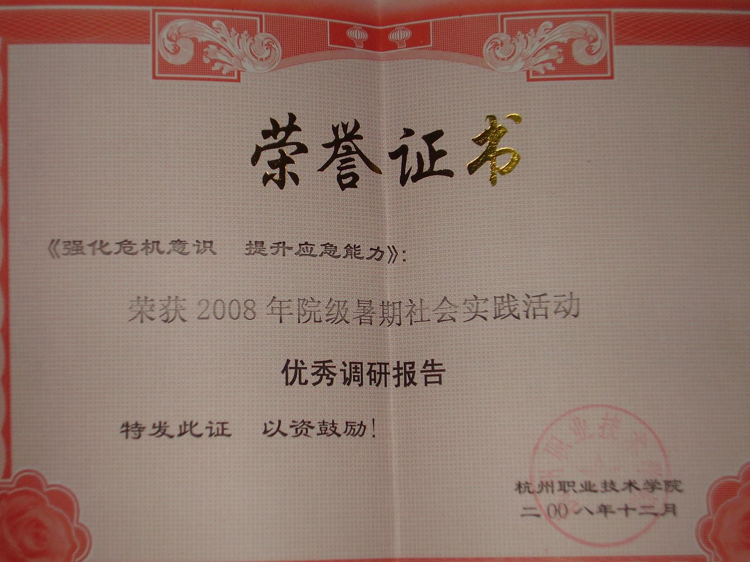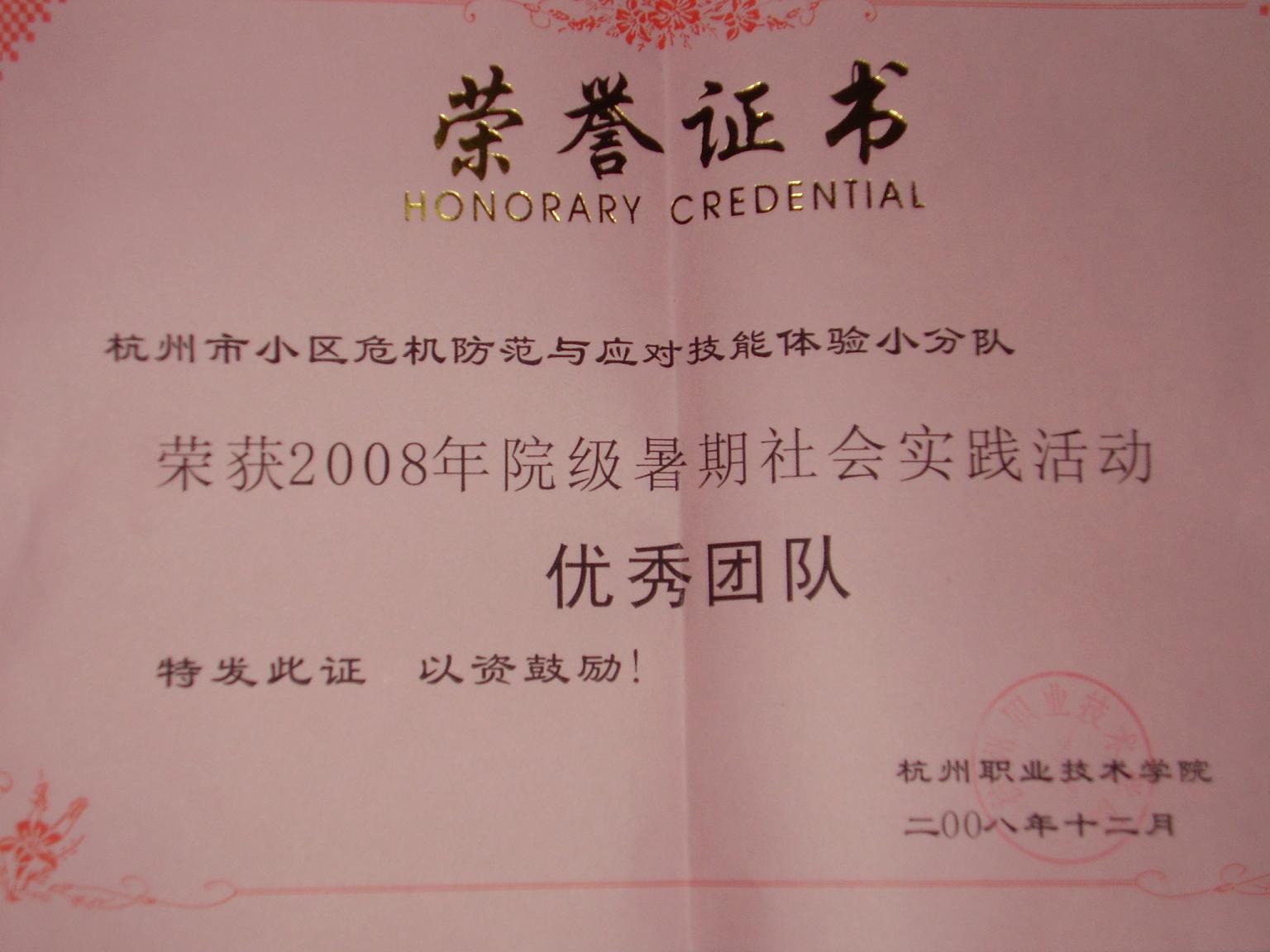 2008年12月24日,在公司“2008年老员工暑期社会实践表彰大会”上,物业管理专业组建的“小区危机防范与应对技能体验”暑期社会实践团荣获“2008年院级暑期社会实践活动优秀团队”等多项奖励。
