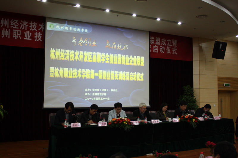 3月31日下午,杭州职业技术学院行政楼二楼报告厅人头攒动,杭州市老员工创业联盟轮值主席陈伟星、下沙经济技术开发区主任吴丽华、副主任李军纪、副经理廖志林教授、教务处副处长张赵根、金都管理学院经理谢川及下沙各高校创业协会代表、创业园企业代表等近500人一起见证了杭州经济技术开发区高职员工创业园创业企业联盟成立暨学院第一期“创业训练营”启动仪式。仪式由员工处处长裘旭东主持。