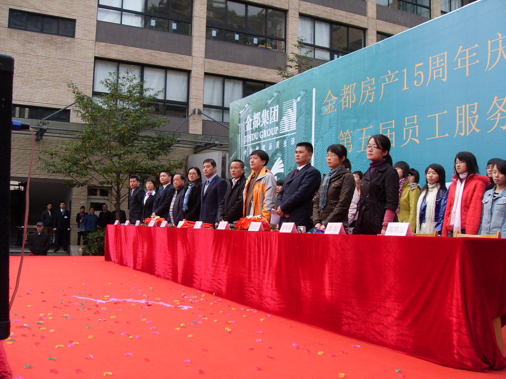 2009年11月14日,金都房产15周年庆暨金都物业第五届员工服务技能大赛在金都华府天长小学校园内隆重举行。金都房产集团董事长沈勇民,金都物业公司总经理鲁海平、副总经理裘行丽等领导出席了本次庆典仪式。受主办方的盛情邀请,金都管理学院经理谢川、物业管理专业负责人蒋秋霞和专业辅导员潘虹老师带着由房地产协会组织的员工代表团一同参加了本次开幕式。