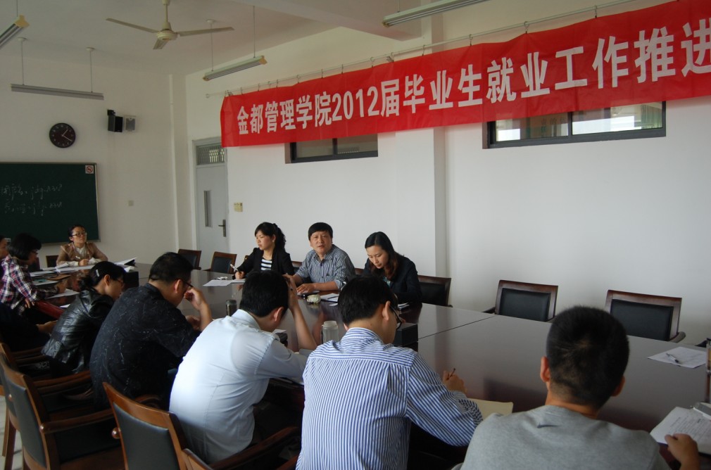 2012年5月2日下午13:00,金都管理学院2012届就业工作推进会议在分院三楼会议室召开。金都管理学院经理谢川、党总支书记韩亮、副经理戴凤微、各专业组(方向)负责人、全体毕业班班主任及相关辅导员参加了会议,会议由韩亮书记主持。