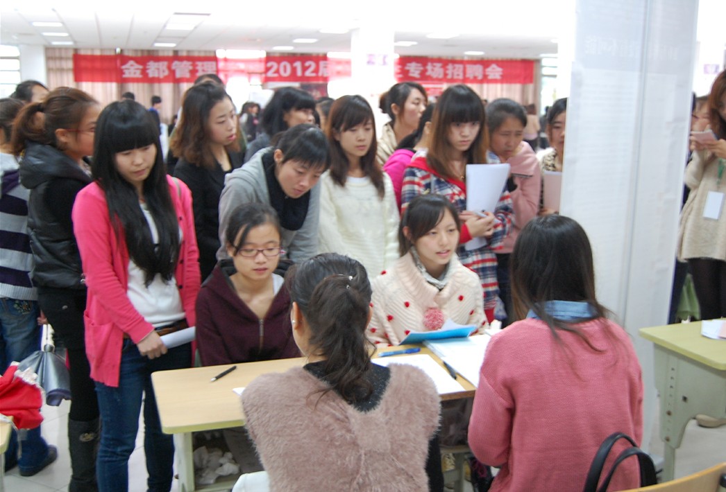 2011年11月9日下午,在学校有关职能部门的大力支持协助下,金都管理学院2012届毕业生招聘会在现教中心一楼大厅举行。本次招聘会吸引了金都物业公司、杭州绿城物业服务有限公司、杭州网贝网络科技公司、上海东方激光教育文化公司、浙江物业有限公司、杭州肯创投资管理咨询有限公司等近50家省内外企事单位,招聘岗位涉及IT、金融、机械、纺织、化工、商贸等多类行业领域。