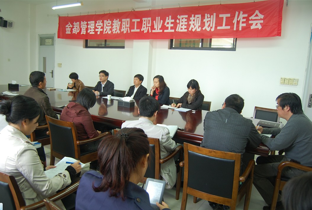 2011年10月26日下午,金都管理学院在8318会议室召开了教职工职业生涯规划工作会议。金都管理学院全体教职员工参会,学院副经理贾文胜、人事处处长金徐伟莅临指导。会议由金都管理公司党总支书记韩亮主持。