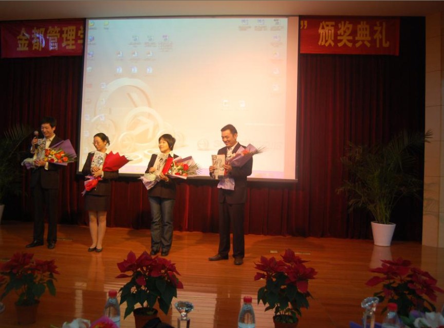 秋风送爽,丹桂飘香。2010年10月20日下午,学院行政楼二楼报告厅掌声雷动,金都管理学院第三届“我最喜爱的老师”颁奖典礼在此拉开帷幕。金都管理学院理事会理事、金都集团助理总裁郁平、金都管理学院全体教师及员工代表计470人参加。 在金都管理学院员工文工团带来的一段精彩开场舞后,最佳新秀奖得主率先揭晓,他们分别是陈晓红老师、陆燕萍老师、潘虹老师和戚建华老师,员工代表送上了奖杯与鲜花,“谢谢鼓励,继续努力”简短而又真切的获奖感言得到了在座员工们的一片掌声。接着,最佳职业形象得主施卓晨老师、沈黎嫣老师,最佳敬业奖得主孙丽老师,最具亲和力奖得主杨强老师相继出炉。现场的同学们此刻高声呐喊着“老师,我们永远支持您”,喊出了他们心中对老师的爱,使台上的老师感动万分。期间,穿插的古筝伴舞《师生情》、师生合唱《爱,因为在心中》等节目,将现场气氛推向了高潮。