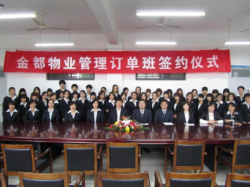 学院的廖志林副经理也发表了热情洋溢的讲话,他首先代表学院感谢金都房产集团对学院开展校企合作工作的支持,希望双方通力合作,互惠双赢,并通过订单班的组建,进一步开展团队互聘、共建培训平台等深层次的合作,共同提升学校的办学质量与企业的管理水平。此外,廖经理还对41位订单班的同学提出了希望与要求,希望同学们能够抓住学院和企业共同提供的实践平台,将学院的校训和金都的企业文化有机融合,顺利完成订单班的课程及后续的顶岗实习任务,在工作岗位上实现自己的人生价值。 王为民副总裁也同样表达了对金都订单班成立的祝贺与喜悦之情。他说,金都集团自1994年成立以来,16年间开发的项目总建筑面积已达约600万平方米;其中,促成公司成长最关键的一大要素就是人才。如今,通过订单班的模式培养人才,是一种“多赢之举”,企业方面参与学校教学计划的制定,并派专业人员进行授课,教学与实践紧密结合,融入企业文化和管理理念,能够有效提高人才培养质量。他希望订单班的同学要记住,今后他们不仅仅是在校的老员工,更是金都集团的一分子,要时刻注意将金都文化融入到学习中去,以圆满完成“金都”班的学习任务,并顺利到金都参加工作。 面对学院和企业的殷切期望,毛鑫和王丽君同学代表全体订单班员工表达了好好学习、努力练习技能的坚定决心。最后,企业领导、分院领导和“金都订单班”员工三方签订了《金都订单班协议书》,签约仪式至此画上了一个圆满的句号;同时也标志着金都管理学院与金都房产集团在深入发展“校企共同体”、探索人才共育模式上的一个全新的开始。