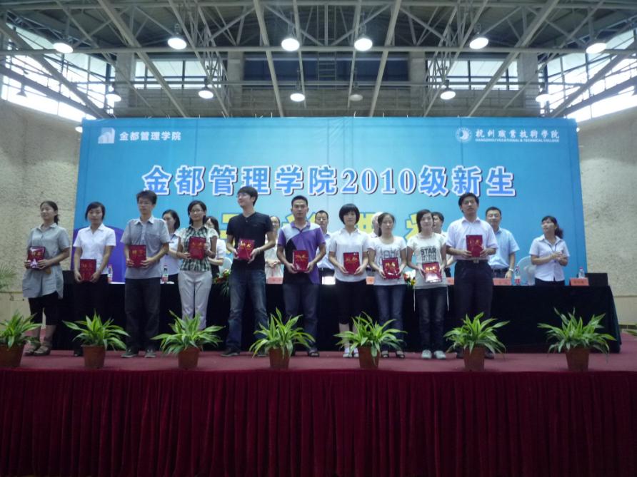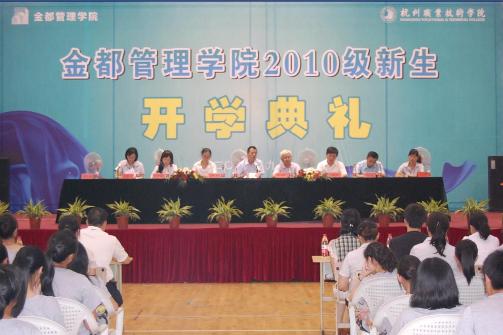 2010年9月16日下午,金都管理学院在校体育馆隆重举行了2010级新生开学典礼。参加典礼的领导及嘉宾有金都房产集团总裁、金都管理学院理事会理事长吴忠泉;杭州职业技术学院副经理、金都管理学院理事会副事长廖志林;以及金都房产集团的领导郁平、裘行丽、宋超;金都管理学院经理谢川、副经理戴凤微、优秀员工代表等。典礼由金都管理公司党总支书记韩亮主持。