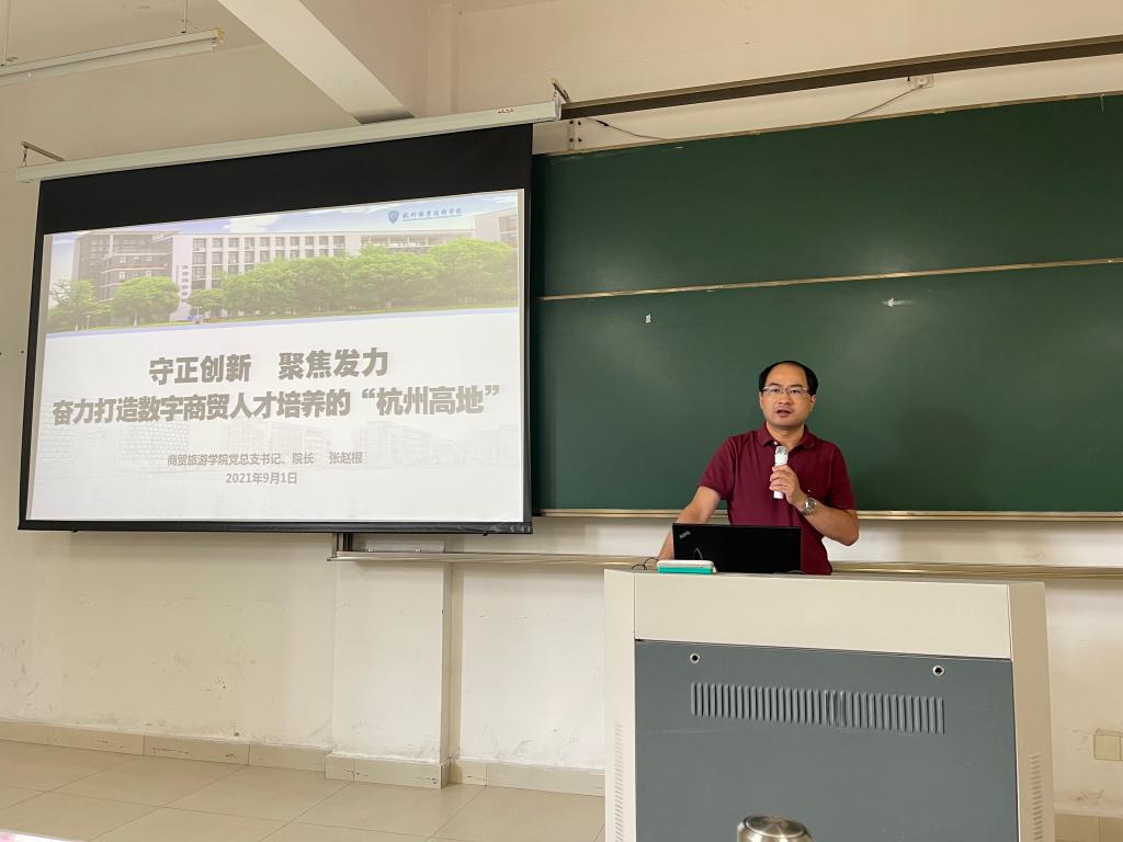 张赵根以“守正创新,聚焦发力,奋力打造数字商贸人才培养的‘杭州高地’”为题,传达学习了学校暑期干部读书会等有关会议精神,回顾了分院暑期重点工作,提出了新阶段分院内涵建设的思考,并就新学期重点工作进行了部署。他与全体教职工一起分享了建设数字商贸专业群的“十四五”建设目标和构想,并对深化推进党史学习教育、落实意识形态责任、常态化疫情防控、跨境电商职教集团建设、电子商务国家级教学创新团队建设、职教本科培育计划申报、跨专业共享教学资源建设、拔尖创新人才培养、高层次人才引进等重难点工作进行了部署强调。他要求全体教职工振奋精神、真抓实干,主动融入学校“双高”建设和“数智杭职”建设的发展大局,为加快推进分院“十四五”高质量发展添砖加瓦。