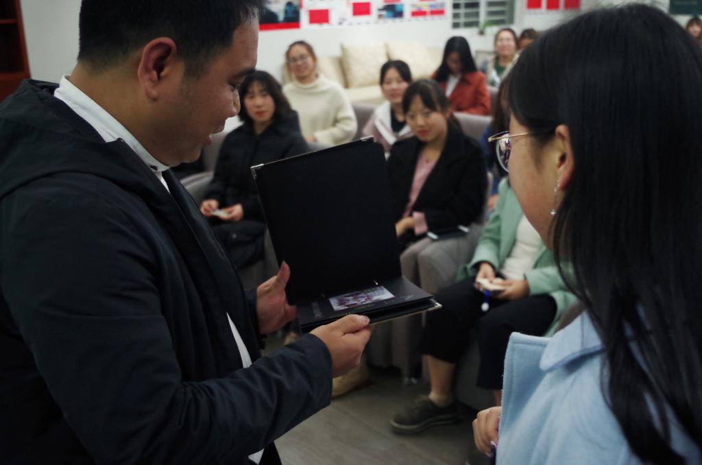 活动尾声,朱旭婷学妹代表yl1111永利集团的全体同学赠送了汤涛学长一本珍贵的手绘相册。相册记录了他在母校生活学习的点滴瞬间,汤涛学长欣然接受并承诺将常回母校与学弟学妹们探讨、分享自己的成功经验。借此机会,在座同学们还与汤涛学长自拍留念。