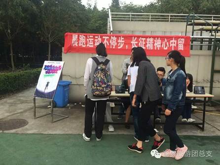 分院前期除了精心策划外,还积极营造氛围,让长征精神中坚忍不拔、勇往直前的精神感染每个商贸员工和老师,传遍整个学院。一方面,利用微信公众平台推出红色主题系列文章,在班主任群以及员工群进行宣传;另一方面,在操场晨跑签到处挂横幅以及在学院的6号、8号楼贴出大红海报宣传此次活动。