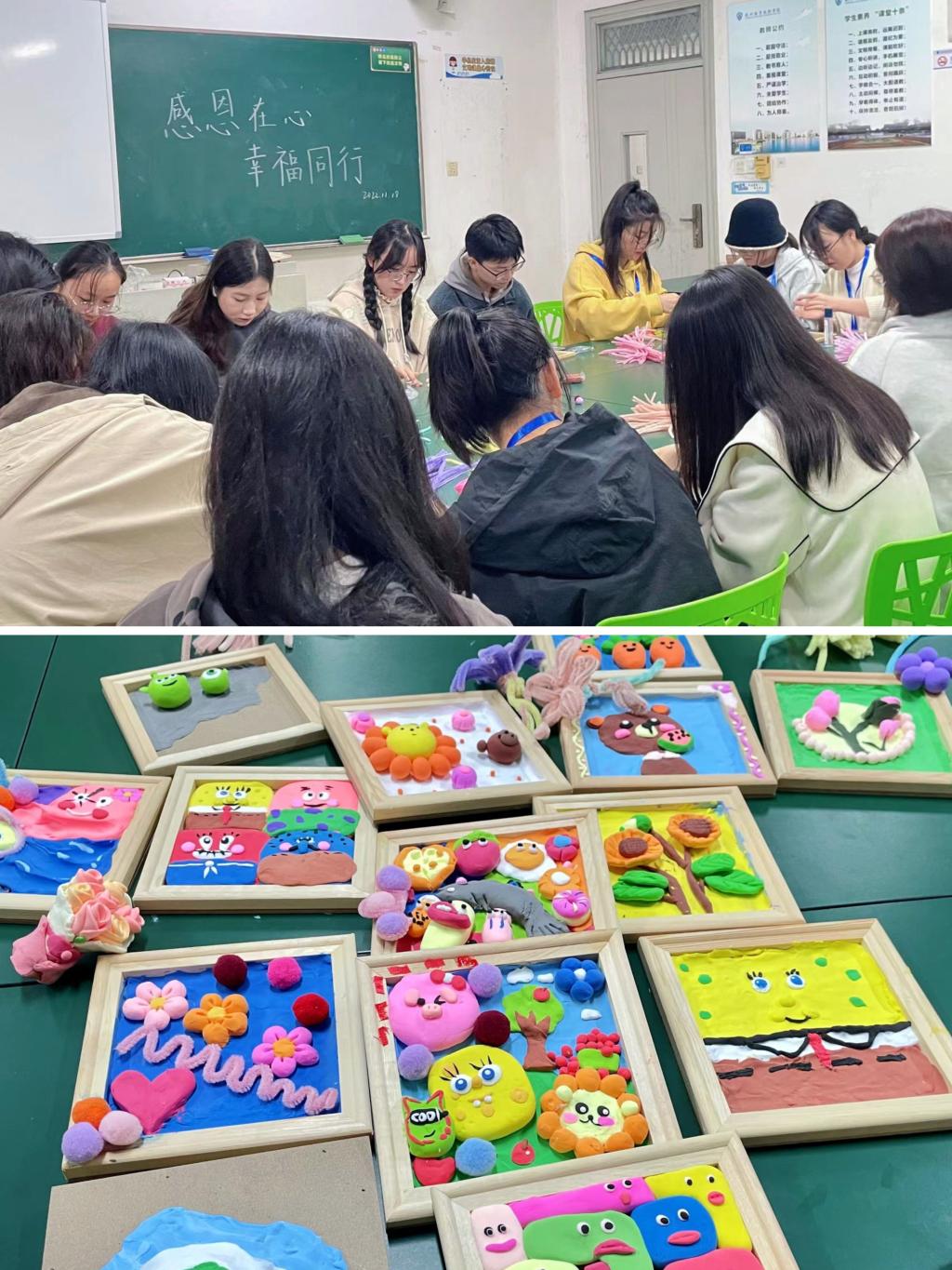 活动以赠送手工制作粘土相册画为媒介,表达对亲人朋友的感谢之情。圆心舍成员给参与员工分配了相应的手工工具,同学们积极参与、思维踊跃、脑洞大开,对照教学视频学习并相互分享和借鉴制作方法。在同学们的努力下,画框中呈现出一朵朵栩栩如生的鲜花立体图案。礼轻情意重,同学们相互赠与,拉近了彼此的距离,活动在欢声笑语中落下帷幕。