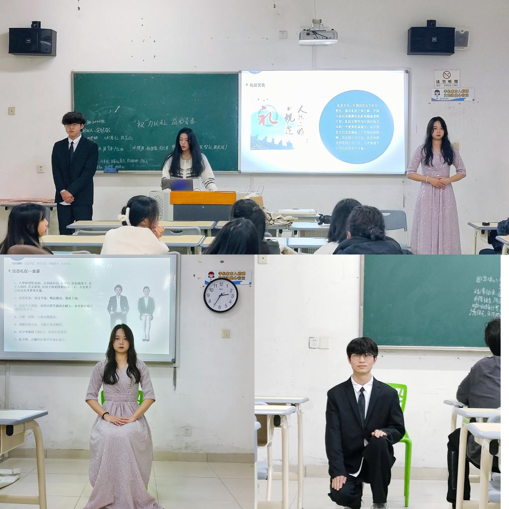 在此次活动中,礼仪队的同学通过走班的方式重点讲解了公共场所、教学场所、用餐场所、员工宿舍和网络阵地等“五个区域”的礼仪规范,并发出老员工文明修身倡议。她们从实际生活出发,结合人际交往礼仪与尊师重教传统,亲身示范讲解了站姿、坐姿、蹲姿、走姿以及贴面礼、鞠躬礼、拱手礼等礼仪规范,动作标准,举止大方,赢得了同学们的阵阵掌声。为加深同学们对礼仪规范的理解,礼仪队成员还带领同学们一同观看了相关主题视频,邀请同学们现场展示,并及时纠正。同学们纷纷表示受益匪浅,更加明晰了礼仪在日常学习、生活中的规范性、重要性。