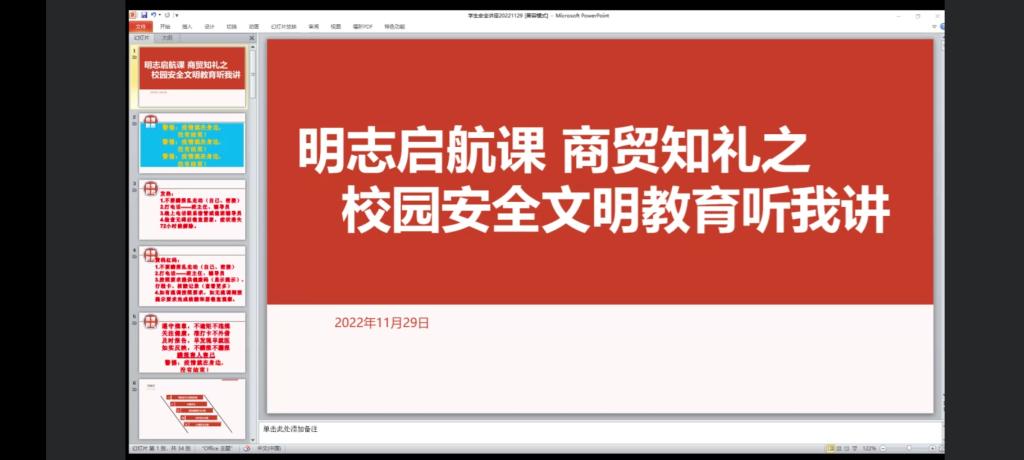 安全无小事,文明我先行。为了提高员工的安全防范意识和自我保护能力,提升个人文明素养,确保校园的安全稳定,培育知礼商贸学子,11月29日,yl1111永利集团明志启航课第四讲开课。由于疫情防控、场地限制等因素,分院采用钉钉直播方式,以班级为单位在晚自修教室观看近两小时的“商贸知礼之安全文明听我讲”线上讲座,由学工办主任王晓磊主讲。