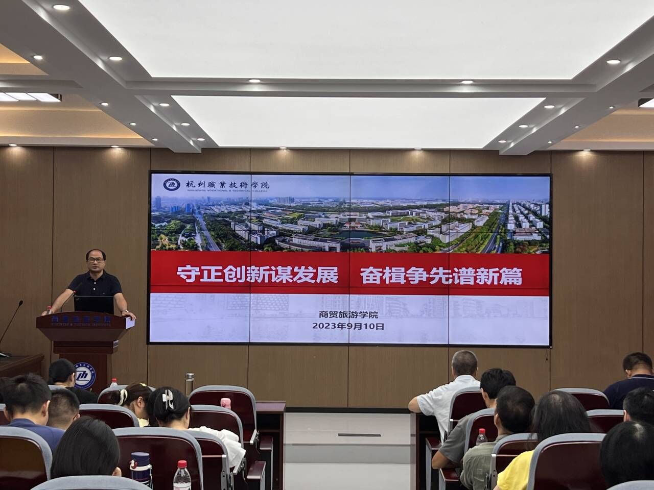 会上,张赵根对上学期以来的主题教育活动开展情况进行了全面总结,并以“守正创新谋发展 奋楫争先谱新篇”为题作新学期工作部署。他首先传达学习了学校暑期中层干部读书会和学校学习贯彻习近平新时代中国特色社会主义思想主题教育总结会等重要会议精神,总结回顾了分院暑期重点工作开展情况,分析了当前分院改革发展存在的瓶颈问题和突破重点,并对新学期重点工作进行部署,要求全体教职工认真领会会议精神,认清职业教育改革发展形势,深入学习教育部关于深化现代职业教育体系改革的意见及11项重点任务要求,敢闯善为、乘势而上,着力打造高水平专业建设成果。他希望全体教职工要走出“舒适区”,做一名持续精进的成长型教师,勠力同心、团结奋进、克难攻坚。同时要全面做好亚运服务保障工作,重点关注师生安全特别是意识形态安全,为亚运盛会贡献商贸力量。随后,周佳良和袁江军就期初教学工作、专业内涵建设、员工报到、安全稳定等工作进行了部署和强调,要求各条线扎实做好开学保障工作,确保新学期各项工作平稳有序推进。