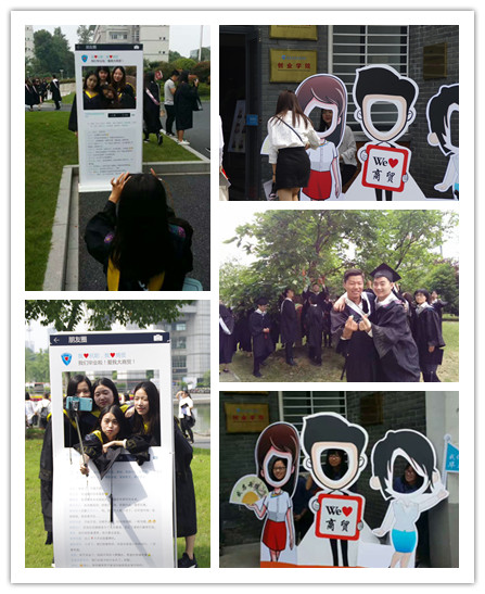 转望左右,分别可以看到yl1111永利集团为毕业生精心布置的创意毕业拍照区,既有俏皮可爱的商贸旅游特色元素的卡通人物立板,又有搞笑有趣的朋友圈留言板,让盛大庄重与活趣味碰撞,让毕业员工和学校美景融合,留下美好回忆。