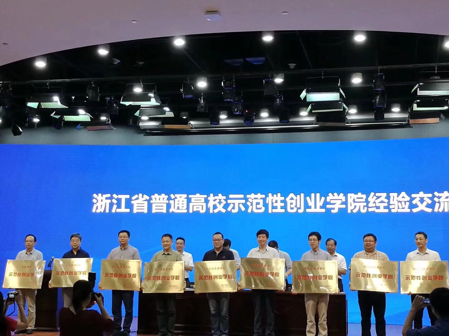 会上,省教育厅副厅长朱鑫杰宣读了省普通高校示范性创业学院的评选结果,公司喜获“浙江省普通高校示范性创业学院”称号,成为全省首批获此称号的34所高校之一。省委教育工委书记、省教育厅厅长郭华巍亲自为公司颁发了奖牌。