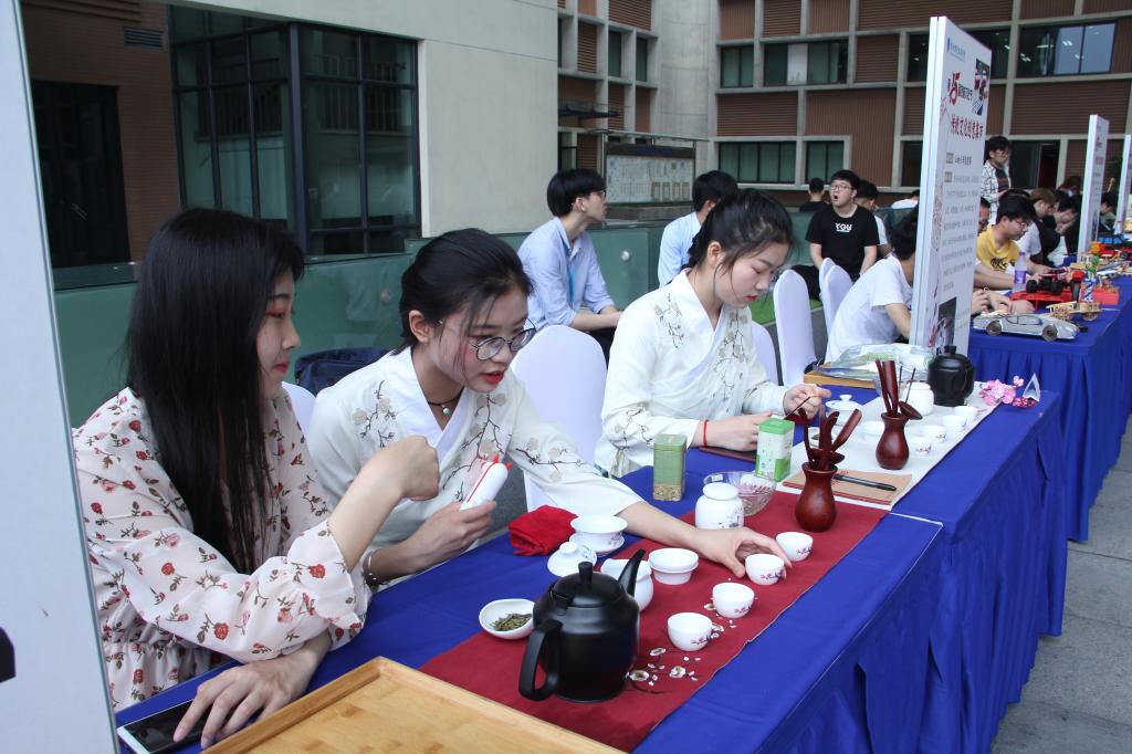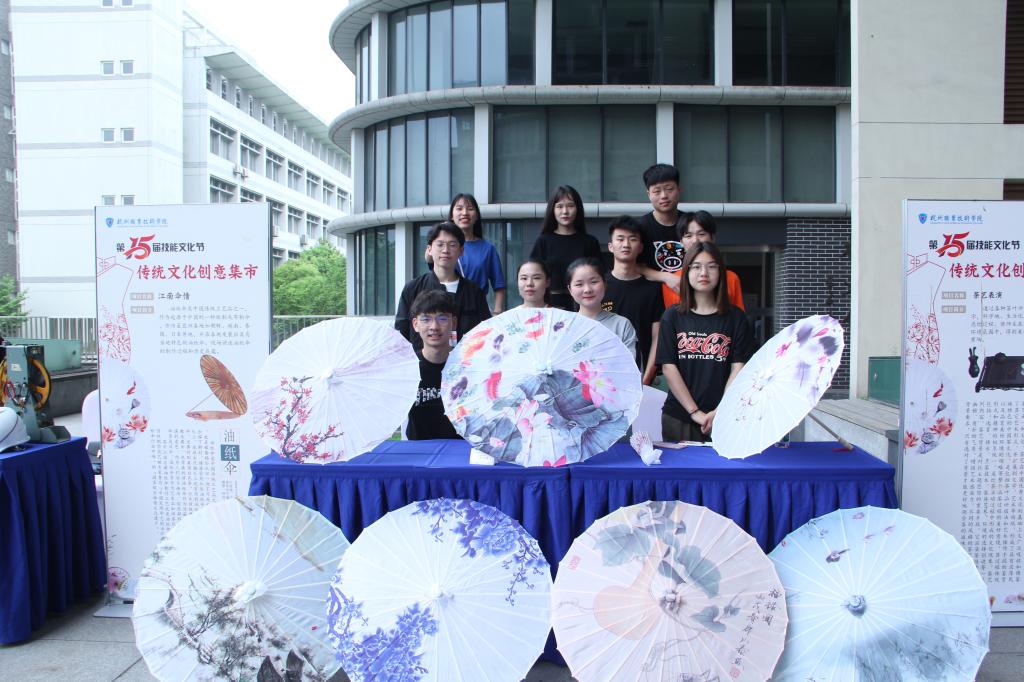 同学们积极参与,创意百出。公司师生结合茶艺表演和油纸伞展示,向来往观众生动演示了传统文化产品的艺术美。茶艺社凭借精致的茶具、娴熟的技艺、优雅的动作给现场观众留下深刻印象。行人走过,茶有余香,茶与茶道精神随风潜入往来人群心底。西湖油纸伞的“前世今生”与民俗风情同样引起参观者的浓厚兴趣,从“鲁班造伞”到伞的美好寓意,再到“纳采”、“纳征”中纸伞的功能,无一不展示着中国伞文化在滚滚历史长河中辉煌的历程……浓浓的江南伞情与宁静淡泊的茶文化相结合,让师生在驻足倾听中就能深深感受到传统文化的静与美。