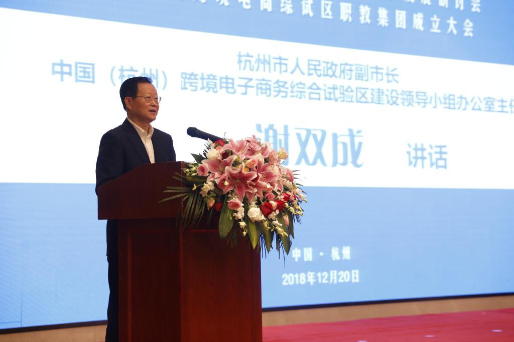 谢双成代表杭州市政府对职业教育集团的成立表示祝贺。他提出,电子商务是杭州十大主导产业之一,杭州也是全球首个跨境电商综合试验区,举行首届数字经济与跨境电商综试区发展研讨会暨全国跨境电子商务综合试验区职业教育集团成立大会,对于电子商务人才培养和跨境电商的发展都是一件意义深远的大事。