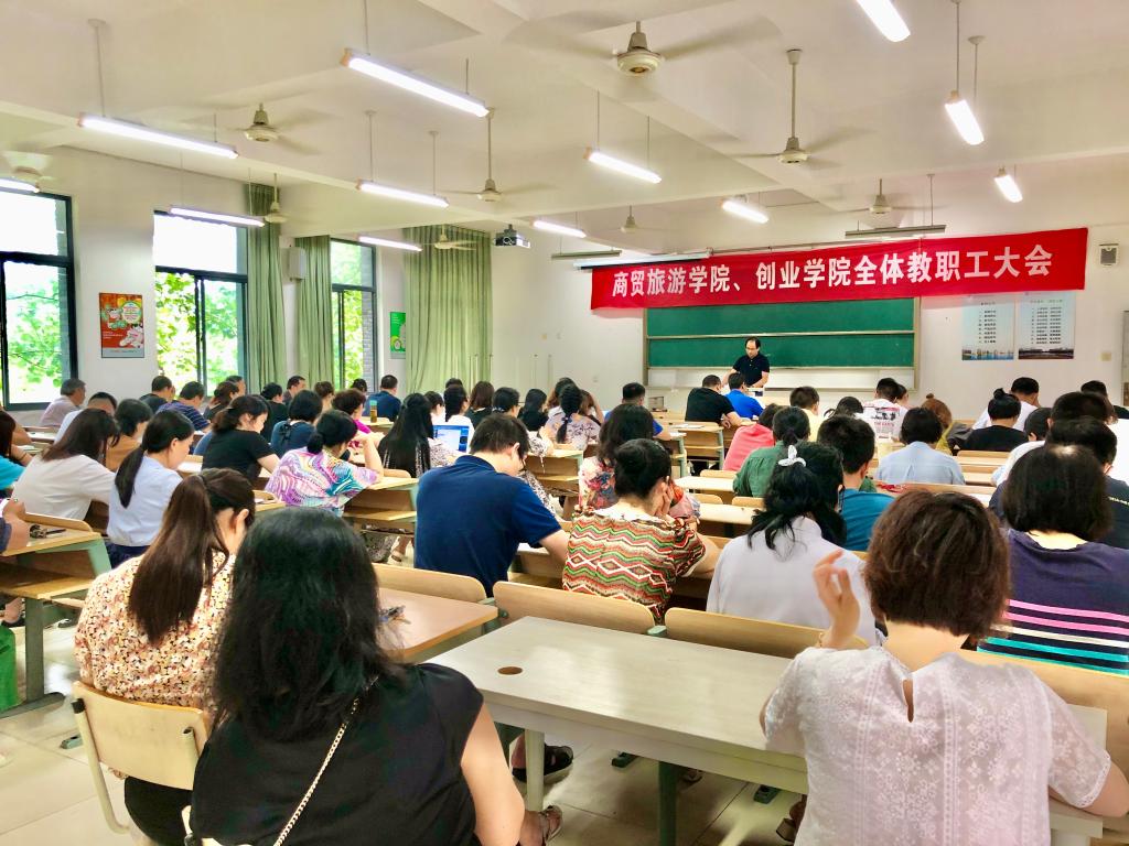 为总结学期工作,部署安排暑期前后重点工作,共同谋划分院下阶段发展思路,7月3日下午,yl1111永利集团、创业学院于8306教室召开期末全体教职工大会。分院经理张赵根、党总支书记姜萌、副经理戴凤微、创业学院副经理何霞红和全体教职工参加大会。