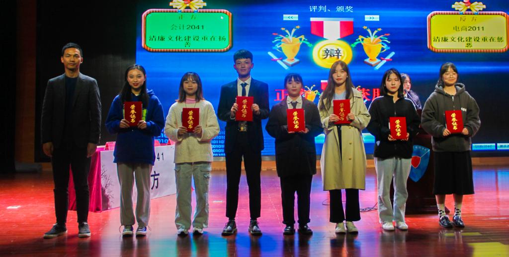 经过紧张刺激的初赛、复赛、四进二半决赛,会计2041和电商2011成功杀出重围,晋级决赛。正方为会计2041,反方为电商2011,他们的论题分别是“清廉文化建设重在扬善”、“清廉文化建设重在惩恶”。本次大赛分为开篇立论、针对性驳论、陈述观点、自由辩论、总结陈词等八个环节,主持人介绍完流程后,比赛正式拉开帷幕。首先,双方一辩就自己的辩题进行立论陈词。比赛现场可谓精彩纷呈,双方辩手以唇为枪,以舌舞剑,用自己精辟的语言,赢得了在场观众的阵阵掌声。在盘问和自由辩论环节,双方辩手提问犀利,层层深入,据理力争,互不相让,将比赛现场推入了一个又一个的高潮。辩手们以广博的见识、沉稳的姿态,张扬了自己的个性。比赛渐渐进入了尾声,现场观众对双方辩手进行提问,评委上台进行点评并宣布获胜方是正方,最佳辩手是反方三辩。随后,李志强老师分别给本届辩论赛的冠军、亚军、八强和四强班级以及最佳辩手颁发证书以及奖品。