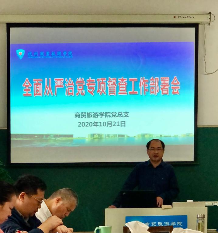 为配合做好公司党委全面从严治党专项督查工作,10月21日上午,商贸旅游公司党总支书记、经理张赵根在8318会议室召集召开了分院关于迎接2020年全面从严治党专项督查工作部署会,分院全体班子成员、全体中层干部、 各支部书记及各专业负责人参加会议,会议由张赵根主持。